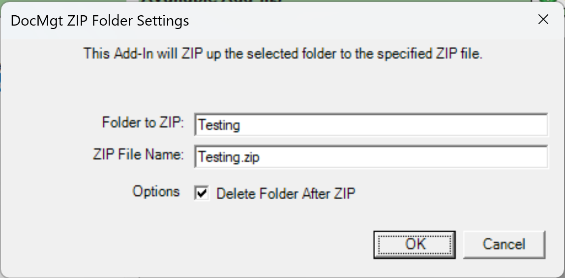 Delete Folder: If checked ON then the folder will be deleted after the files are ZIPPED.
