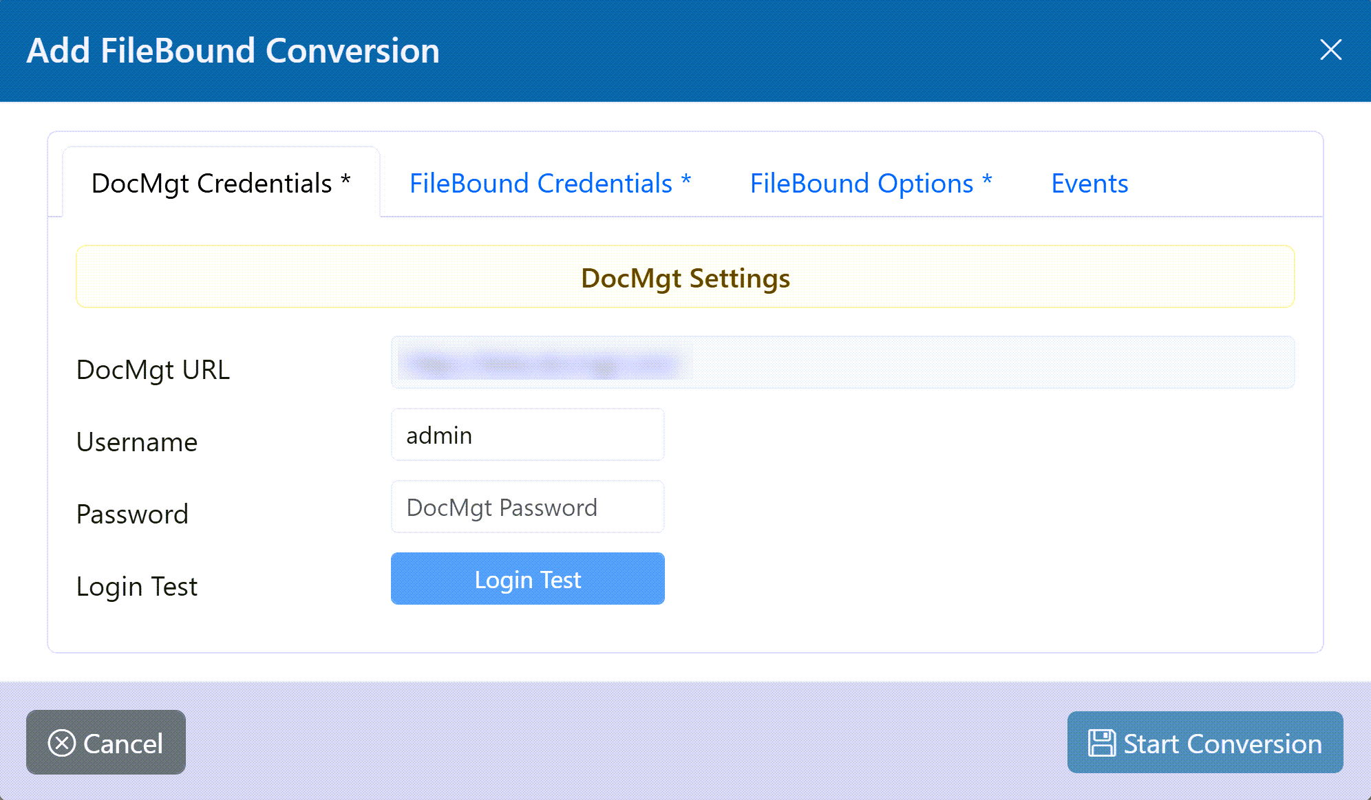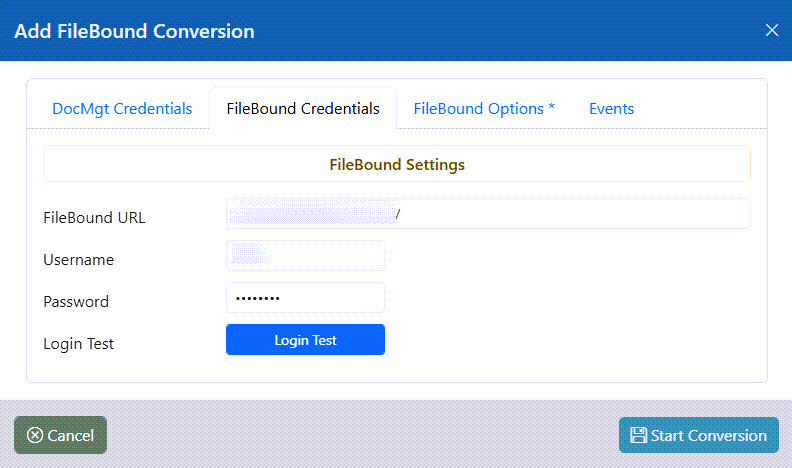 Enter the FileBound credentials to use for the conversion. This includes the URL, Username and Password to log into the Filebound site. This user must have access to the Project(s) that you wish to convert.
