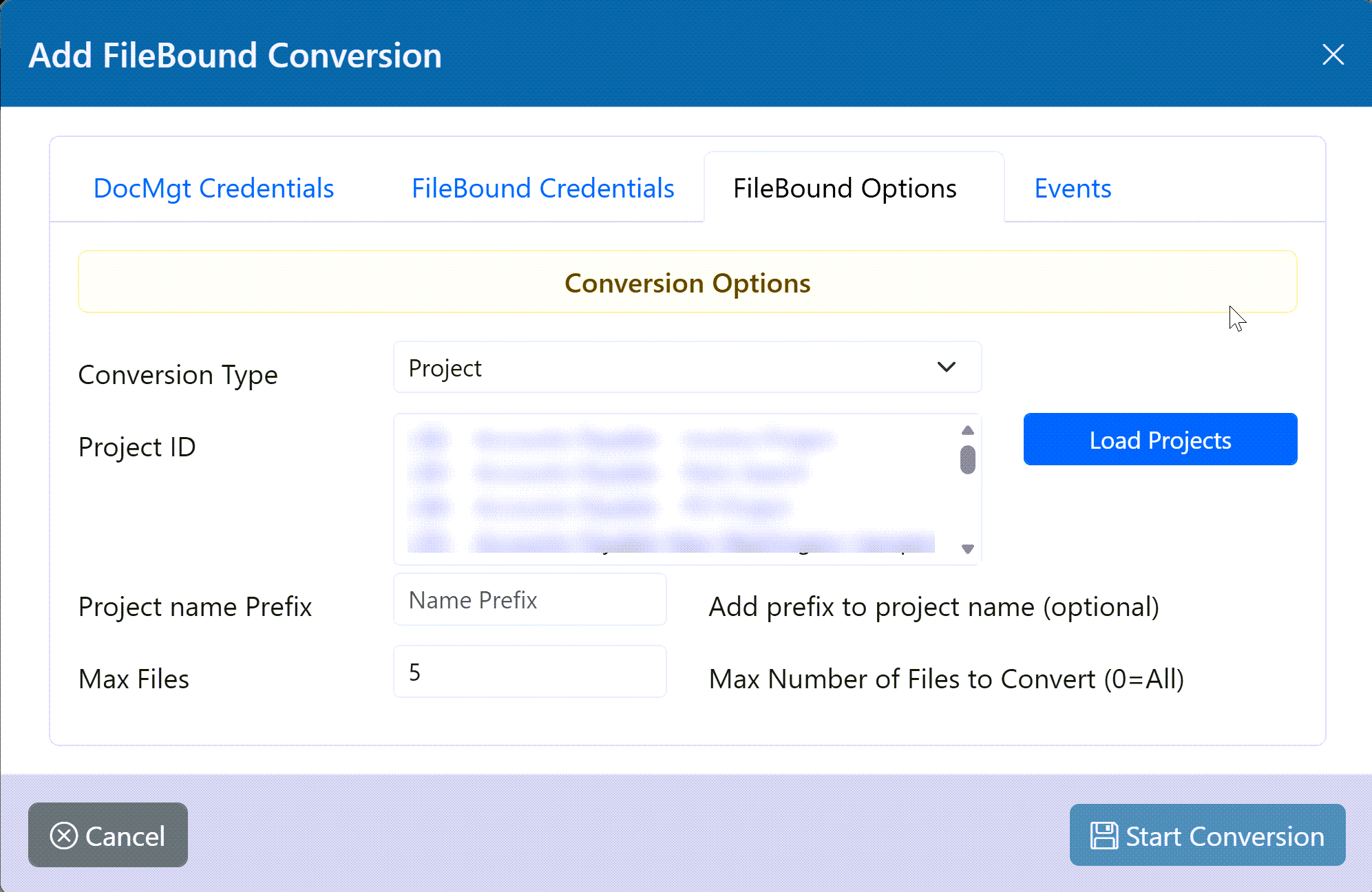 Max Files - The maximum number of files to convert for this conversion. This is useful to do sample conversions and to test your conversions before doing a full conversion. Setting this to 0 will convert all files from the selected project(s).