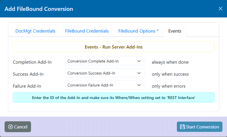You can run DocMgt events after teh conversion via REST Add-Ins. REST Add-Ins are just Add-Ins in DocMgt that have their Where/When setting set to inlude REST. The conversion can call those Add-Ins at the completion of the conversion. Completion Add-In runs at the end of the conversion regardless of whether it was successful or it failed. Suiccess Add-In runs at the end of the conversion but ONLY when it was successful. Failure Add-In runs at the end of the conversion but ONLY when it failed.